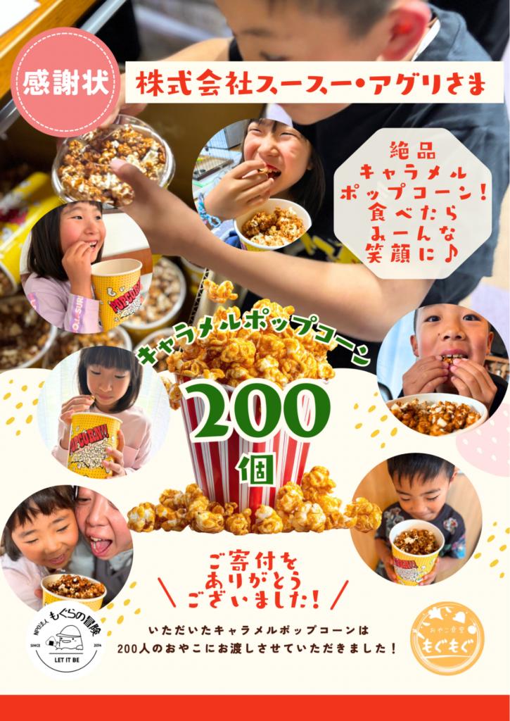 2026-04-28 お知らせ 社長のひとり言 スースー・アグリ ポップコーンの寄付をしました いつもご愛顧ありがとうございます。株式会社スースー・アグリは、千葉県市原市の地域のみなさまとのつながりを大切に、子ども食堂「もぐらの冒険」および4月19日のマルシェにて、キャラメルポップコーン約200人分を寄付させていただきました。 これからも、食を通じて地域に寄り添う活動を続けてまいります。 NPO法人 もぐらの冒険様のSNSでもご紹介いただいておりますので、ぜひご覧くださいませ。 POST SHARE