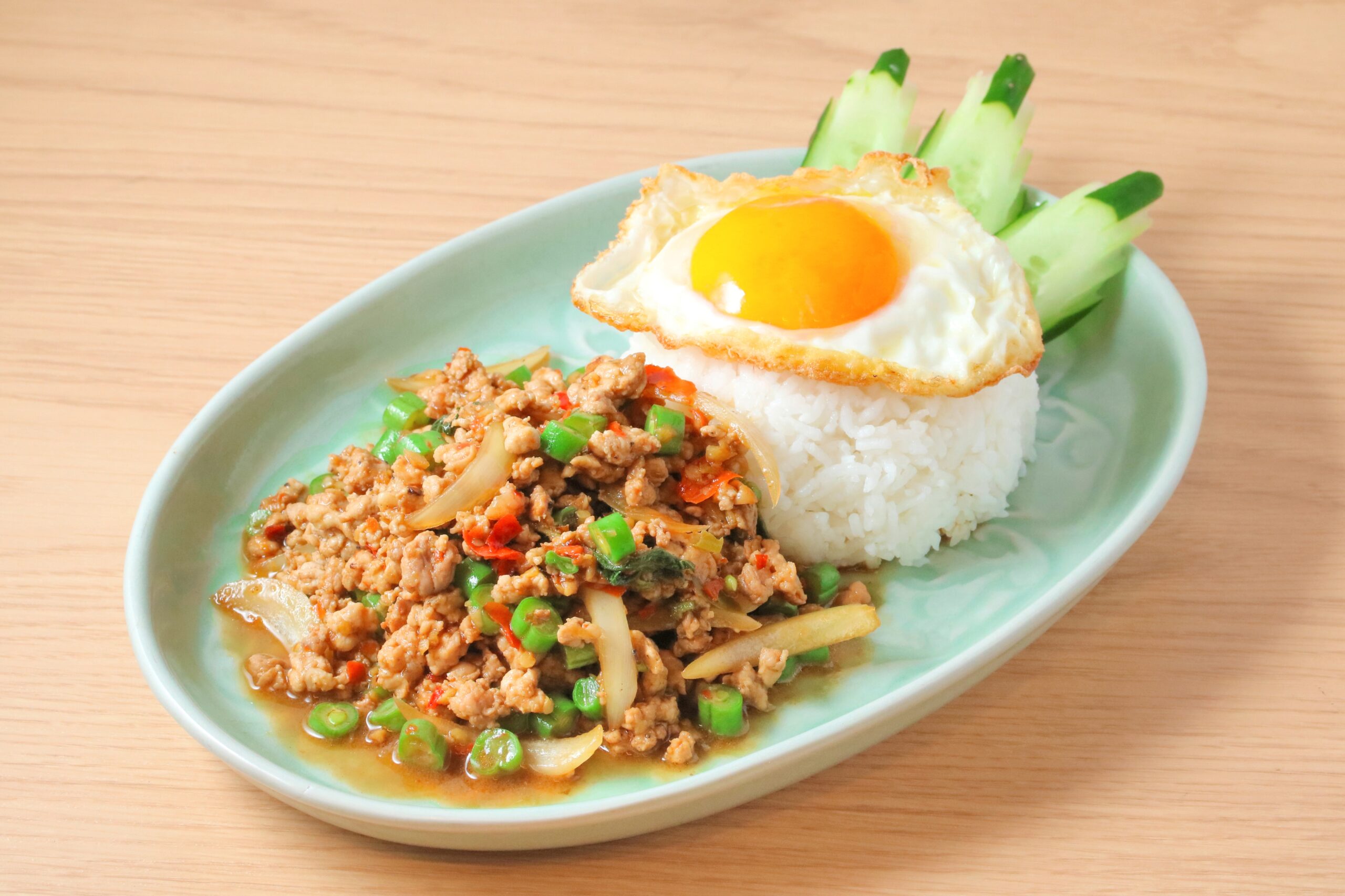 The most popular dish at Thai food stalls and restaurants! A fantastic combination of the Thai herb "Holy Basil" and minced chicken. Served with a must-have fried egg, the Thai way is to mix in the semi-cooked yolk while enjoying this flavorful dish.